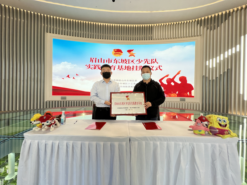 儀式上,金恒德維康與共青團東坡區委員會簽訂眉山市東坡區少先隊實踐教育基地協議。隨后,共青團東坡區委員會書記李登科向眉山金恒德維康文創旅游發展有限公司授牌,眉山維康國際文創基地正式成為眉山市東坡區少先隊實踐教育基地。