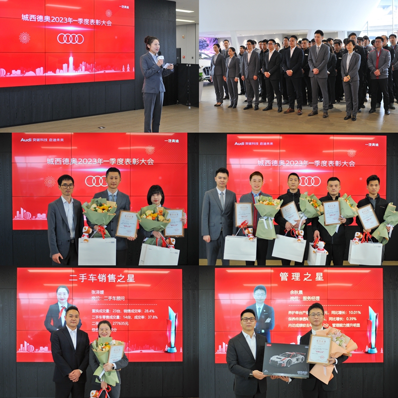 為表彰先進典型,發揮榜樣力量,進一步激發員工們奮發向上、勇爭第一的拼搏精神,4月3日上午8點,城西德奧在銷售展廳舉行了2023年一季度先進表彰大會。本次表彰大會由銷售經理赫旭主持,各部門一線業務人員、主管、經理參加了本次會議。