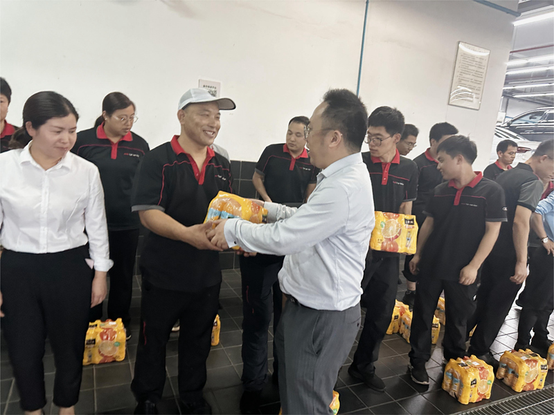 寧波德奧執行總經理沈一彪攜部門總監向一直堅守在高溫環境下作業的一線員工、保安、保潔帶去了暖心的問候,并送上清涼解暑飲品。同時,沈總叮囑大家要勞逸結合,注意身體健康,防止高溫中暑,要更科學、更合理地安排好作息時間。