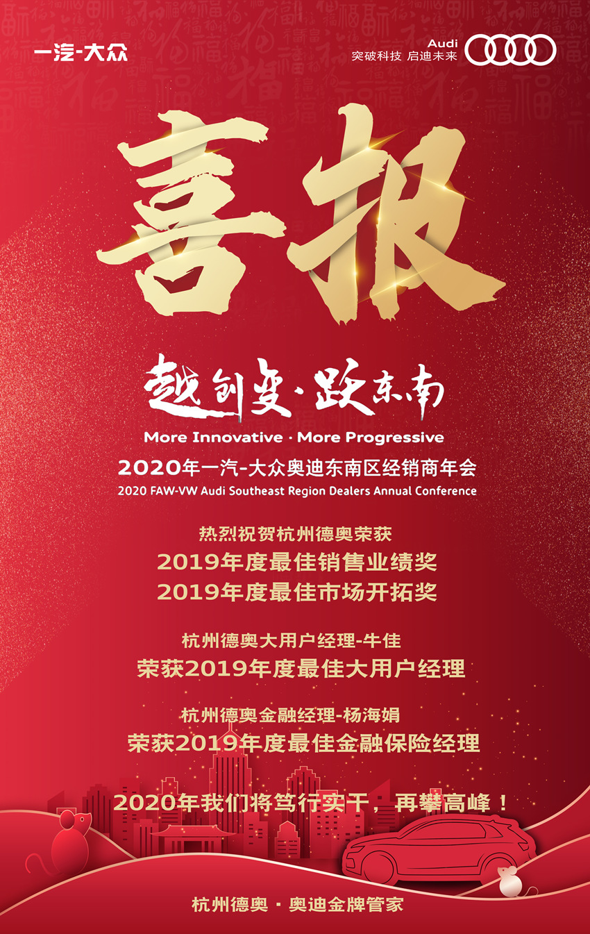 2020年1月6日,“越創變·躍東南”2020年一汽-大眾奧迪東南區經銷商會議在美麗的東海之濱---舟山隆重舉行。杭州德奧汽車有限公司憑借2019年度優異的經營業績及出色的運營表現,再次獲得多項殊榮:年度最佳銷售業績獎、年度最佳市場開拓獎、年度最佳大用戶經理、年度最佳金融保險經理。